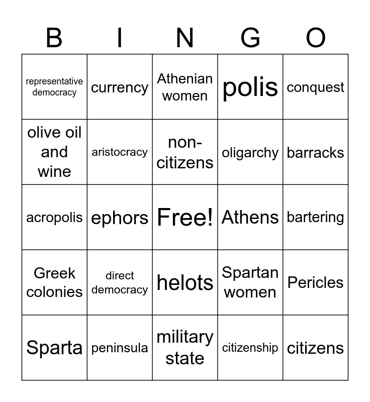 This bingo card has a free space and 24 words: direct democracy, peninsula, non-citizens, Sparta, conquest, representative democracy, olive oil and wine, currency, Athens, helots, oligarchy, acropolis, Spartan women, Pericles, aristocracy, citizenship, bartering, Athenian women, barracks, ephors, citizens, Greek colonies, polis and military state.