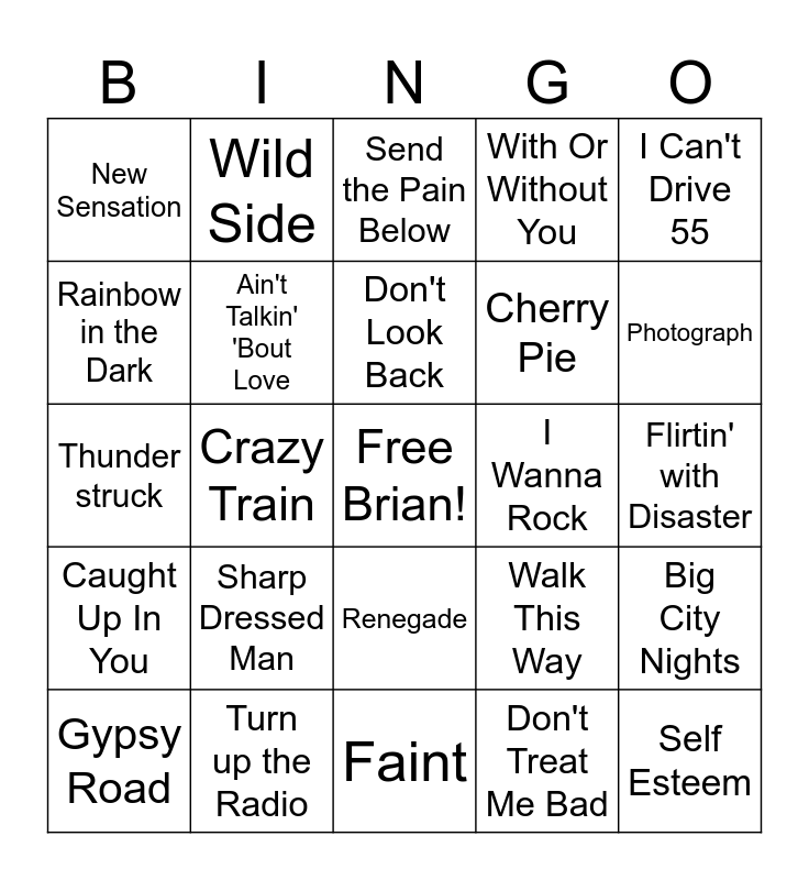 This bingo card has a free space and 34 words: Empire, Don't Treat Me Bad, Rockstar, All Star, Caught Up In You, Ain't Talkin' 'Bout Love, I Can't Drive 55, Gypsy Road, Wild Side, Lay It Down, Don't Look Back, Send the Pain Below, Higher, Fuel, I Wanna Rock, Photograph, Turn up the Radio, Thunder struck, Sharp Dressed Man, Walk This Way, Renegade, Train, Train, New Sensation, Flirtin' with Disaster, Faint, Self Esteem, With Or Without You, Cold, Cherry Pie, Rainbow in the Dark, Still of the Night, Crazy Train, Big City Nights and Take Me Home Tonight.