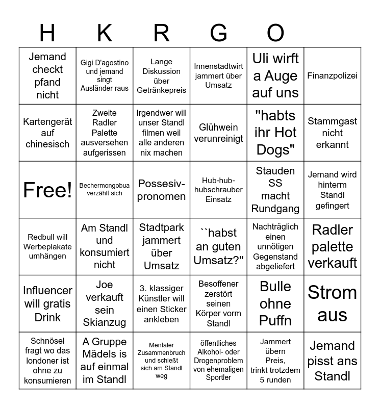 This bingo card has 36 words: Besoffener zerstört seinen Körper vorm Standl, 3. klassiger Künstler will einen Sticker ankleben, öffentliches Alkohol- oder Drogenproblem von ehemaligen Sportler, Kartengerät auf chinesisch, Redbull will Werbeplakate umhängen, Hub-hub-hubschrauber Einsatz, Zweite Radler Palette ausversehen aufgerissen, Mentaler Zusammenbruch und schießt sich am Standl weg, Uli wirft a Auge auf uns, Bulle ohne Puffn, Stammgast nicht erkannt, Innenstadtwirt jammert über Umsatz, Strom aus, Bechermongobua verzählt sich, Glühwein verunreinigt, Jemand checkt pfand nicht, Influencer will gratis Drink, Stauden SS macht Rundgang, Free!, Lange Diskussion über Getränkepreis, Possesiv-pronomen, Am Standl und konsumiert nicht, ``habst an guten Umsatz?'', Stadtpark jammert über Umsatz, Nachträglich einen unnötigen Gegenstand abgeliefert, Gigi D'agostino und jemand singt Ausländer raus, ''habts ihr Hot Dogs", A Gruppe Mädels is auf einmal im Standl, Irgendwer will unser Standl filmen weil alle anderen nix machen, Finanzpolizei, Jemand pisst ans Standl, Schnösel fragt wo das londoner ist ohne zu konsumieren, Radler palette verkauft, Jemand wird hinterm Standl gefingert, Joe verkauft sein Skianzug and Jammert übern Preis, trinkt trotzdem 5 runden.