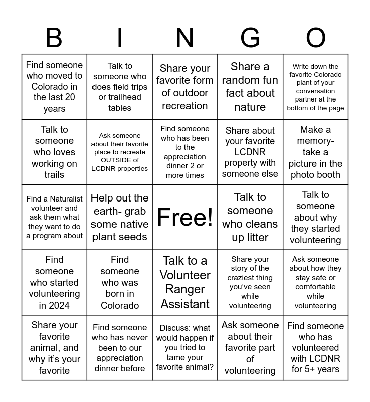 This bingo card has a free space and 24 words: Find someone who was born in Colorado, Find someone who has never been to our appreciation dinner before, Find someone who has been to the appreciation dinner 2 or more times, Share your favorite animal, and why it’s your favorite, Write down the favorite Colorado plant of your conversation partner at the bottom of the page, Find someone who moved to Colorado in the last 20 years, Talk to someone who loves working on trails, Talk to someone who does field trips or trailhead tables, Talk to someone who cleans up litter, Talk to a Volunteer Ranger Assistant, Share about your favorite LCDNR property with someone else, Find a Naturalist volunteer and ask them what they want to do a program about, Share your story of the craziest thing you’ve seen while volunteering, Ask someone about how they stay safe or comfortable while volunteering, Ask someone about their favorite place to recreate OUTSIDE of LCDNR properties, Ask someone about their favorite part of volunteering, Talk to someone about why they started volunteering, Share your favorite form of outdoor recreation, Make a memory- take a picture in the photo booth, Help out the earth- grab some native plant seeds, Find someone who has volunteered with LCDNR for 5+ years, Find someone who started volunteering in 2024, Share a random fun fact about nature and Discuss: what would happen if you tried to tame your favorite animal?.