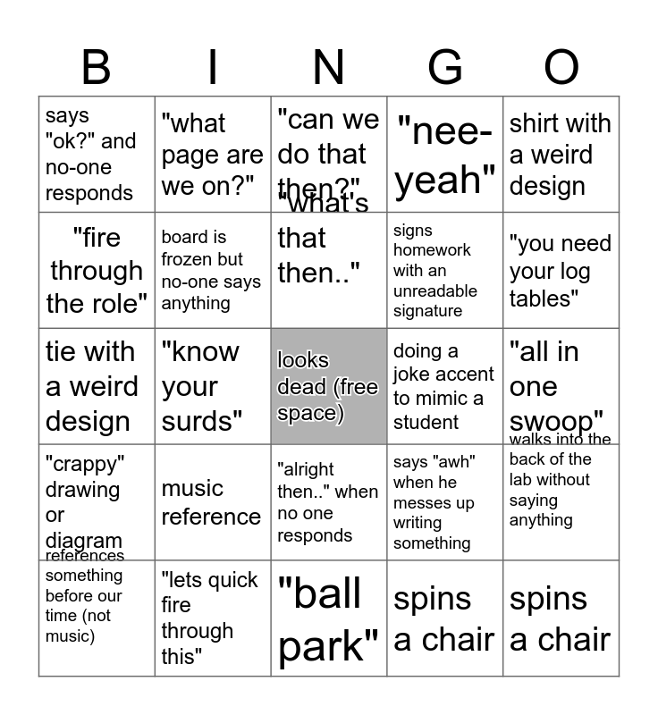This bingo card has a free space and 30 words: "lets quick fire through this", giggles at his own joke, "know your surds", random off-topic question, says "ok?" and no-one responds, "can we do that then?", board is frozen but no-one says anything, "alright then.." when no one responds, doing a joke accent to mimic a student, "ball park", "all in one swoop", spins a chair, spins a chair, smirks overhearing students, "you need your log tables", picks up a stool or chair, says "awh" when he messes up writing something, "crappy" drawing or diagram, music reference, shirt with a weird design, tie with a weird design, asks a question and no one speaks up, "what page are we on?", signs homework with an unreadable signature, "fire through the role", "nee-yeah", walks into the back of the lab without saying anything, references something before our time (not music), "what's that then.." and "alright" or "ok" more than twice in the same sentence.