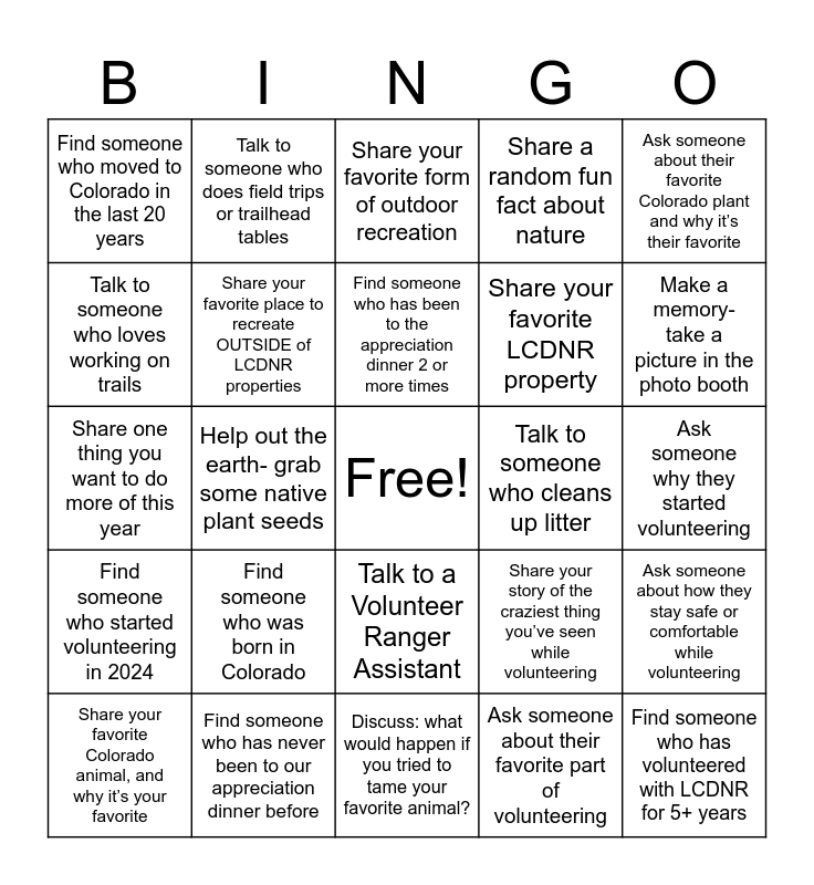This bingo card has a free space and 24 words: Find someone who was born in Colorado, Find someone who has never been to our appreciation dinner before, Find someone who has been to the appreciation dinner 2 or more times, Share your favorite Colorado animal, and why it’s your favorite, Ask someone about their favorite Colorado plant and why it’s their favorite, Find someone who moved to Colorado in the last 20 years, Talk to someone who loves working on trails, Talk to someone who does field trips or trailhead tables, Talk to someone who cleans up litter, Talk to a Volunteer Ranger Assistant, Share your favorite LCDNR property, Share one thing you want to do more of this year, Share your story of the craziest thing you’ve seen while volunteering, Ask someone about how they stay safe or comfortable while volunteering, Share your favorite place to recreate OUTSIDE of LCDNR properties, Ask someone about their favorite part of volunteering, Ask someone why they started volunteering, Share your favorite form of outdoor recreation, Make a memory- take a picture in the photo booth, Help out the earth- grab some native plant seeds, Find someone who has volunteered with LCDNR for 5+ years, Find someone who started volunteering in 2024, Share a random fun fact about nature and Discuss: what would happen if you tried to tame your favorite animal?.