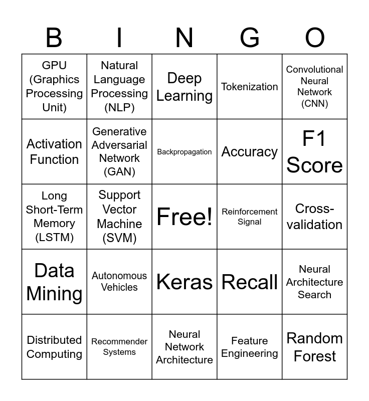This bingo card has a free space and 76 words: Algorithm, Machine Learning, Deep Learning, Neural Network, Supervised Learning, Unsupervised Learning, Reinforcement Learning, Training Data, Testing Data, Model, Optimization, Gradient Descent, Backpropagation, Activation Function, Loss Function, Support Vector Machine (SVM), Decision Tree, Random Forest, K-Nearest Neighbors (KNN), Convolutional Neural Network (CNN), Recurrent Neural Network (RNN), Long Short-Term Memory (LSTM), Generative Adversarial Network (GAN), Natural Language Processing (NLP), Tokenization, Named Entity Recognition (NER), Word Embedding, Text Classification, Image Classification, Object Detection, Image Segmentation, Clustering, Precision, Recall, F1 Score, Accuracy, AUC (Area Under Curve), Confusion Matrix, Cross-validation, Feature Engineering, Data Preprocessing, Feature Scaling, Normalization, Standardization, Data Augmentation, Cloud Computing, Distributed Computing, GPU (Graphics Processing Unit), TensorFlow, PyTorch, Scikit-learn, Keras, Model Deployment, MLOps, Explainable AI (XAI), Federated Learning, AI Bias, Fairness in AI, Ethical AI, Artificial General Intelligence (AGI), Autonomous Vehicles, Robot Process Automation (RPA), Artificial Neural Network (ANN), Cognitive Computing, AI Ethics, AI in Healthcare, Reinforcement Signal, Deep Reinforcement Learning, Quantum Computing, Generative Models, Neural Architecture Search, Data Mining, Recommender Systems, Multi-Agent Systems, Neural Network Architecture and Interactive AI.