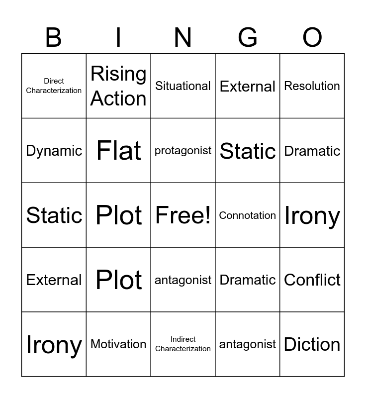 This bingo card has a free space and 55 words: Allusion, Irony, Conflict, Direct Characterization, Indirect Characterization, Round, Flat, Dynamic, Static, Internal, External, Setting, Exposition, Rising Action, Climax, Falling Action, Resolution, Plot, Motivation, Diction, Connotation, Denotation, Dramatic, Situational, Verbal, protagonist, antagonist, Allusion, Irony, Conflict, Direct Characterization, Indirect Characterization, Round, Flat, Dynamic, Static, Internal, External, Setting, Exposition, Rising Action, Climax, Falling Action, Resolution, Plot, Motivation, Diction, Connotation, Denotation, Dramatic, Situational, Verbal, protagonist, antagonist and free.