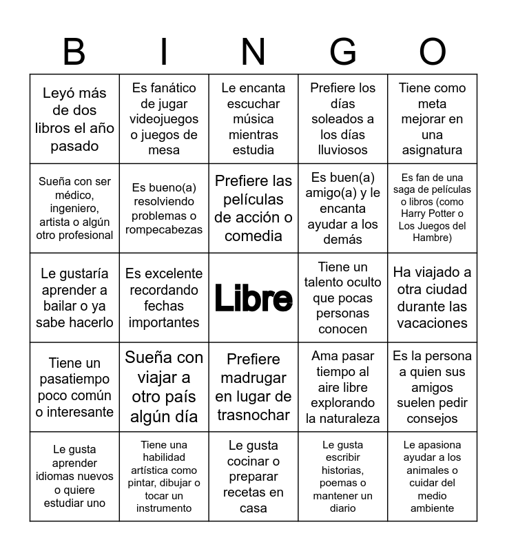 This bingo card has a free space and 24 words: Sueña con viajar a otro país algún día, Tiene una habilidad artística como pintar, dibujar o tocar un instrumento, Prefiere las películas de acción o comedia, Le gusta aprender idiomas nuevos o quiere estudiar uno, Tiene como meta mejorar en una asignatura, Leyó más de dos libros el año pasado, Sueña con ser médico, ingeniero, artista o algún otro profesional, Es fanático de jugar videojuegos o juegos de mesa, Tiene un talento oculto que pocas personas conocen, Prefiere madrugar en lugar de trasnochar, Es buen(a) amigo(a) y le encanta ayudar a los demás, Le gustaría aprender a bailar o ya sabe hacerlo, Ama pasar tiempo al aire libre explorando la naturaleza, Es la persona a quien sus amigos suelen pedir consejos, Es bueno(a) resolviendo problemas o rompecabezas, Le gusta escribir historias, poemas o mantener un diario, Ha viajado a otra ciudad durante las vacaciones, Le encanta escuchar música mientras estudia, Es fan de una saga de películas o libros (como Harry Potter o Los Juegos del Hambre), Es excelente recordando fechas importantes, Le apasiona ayudar a los animales o cuidar del medio ambiente, Tiene un pasatiempo poco común o interesante, Prefiere los días soleados a los días lluviosos and Le gusta cocinar o preparar recetas en casa.