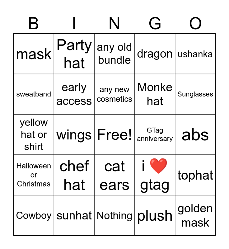 This bingo card has a free space and 24 words: chef hat, sunhat, any new cosmetics, Cowboy, ushanka, mask, sweatband, Party hat, GTag anniversary, cat ears, Monke hat, yellow hat or shirt, i ❤️gtag, tophat, early access, plush, abs, any old bundle, Sunglasses, wings, golden mask, Halloween or Christmas, dragon and Nothing.