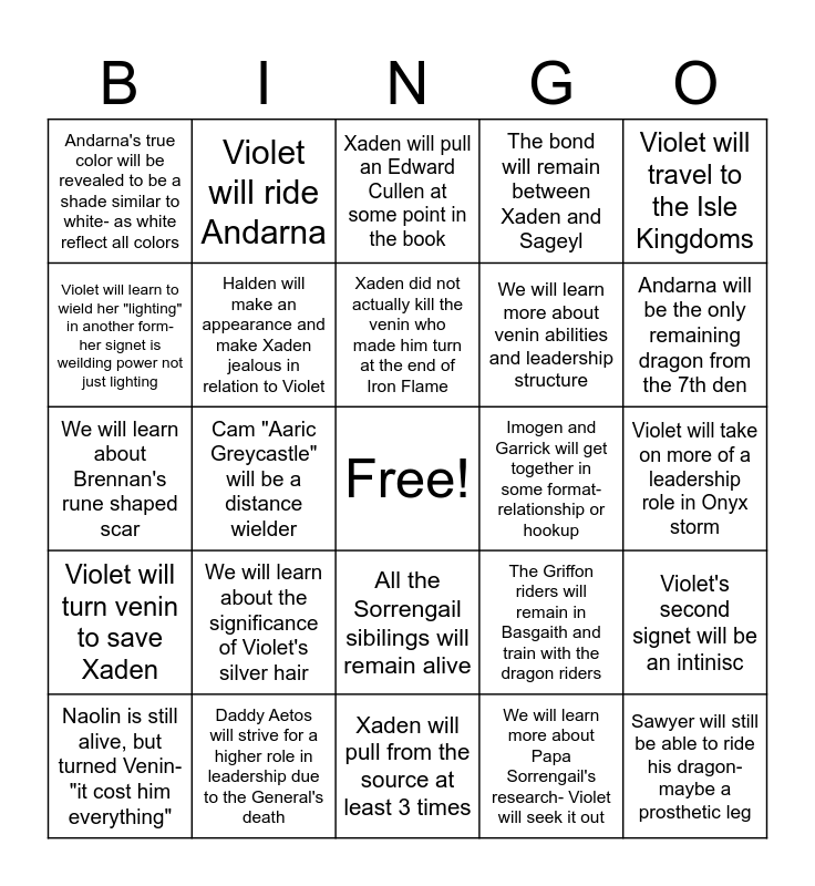 This bingo card has a free space and 24 words: We will learn about the significance of Violet's silver hair, Daddy Aetos will strive for a higher role in leadership due to the General's death, Xaden did not actually kill the venin who made him turn at the end of Iron Flame, Naolin is still alive, but turned Venin- "it cost him everything", Violet will travel to the Isle Kingdoms, Andarna's true color will be revealed to be a shade similar to white- as white reflect all colors, Violet will learn to wield her "lighting" in another form- her signet is weilding power not just lighting, Violet will ride Andarna, Imogen and Garrick will get together in some format- relationship or hookup, All the Sorrengail sibilings will remain alive, We will learn more about venin abilities and leadership structure, We will learn about Brennan's rune shaped scar, The Griffon riders will remain in Basgaith and train with the dragon riders, Violet's second signet will be an intinisc, Halden will make an appearance and make Xaden jealous in relation to Violet, We will learn more about Papa Sorrengail's research- Violet will seek it out, Violet will take on more of a leadership role in Onyx storm, Xaden will pull an Edward Cullen at some point in the book, Andarna will be the only remaining dragon from the 7th den, Cam "Aaric Greycastle" will be a distance wielder, Sawyer will still be able to ride his dragon- maybe a prosthetic leg, Violet will turn venin to save Xaden, The bond will remain between Xaden and Sageyl and Xaden will pull from the source at least 3 times.