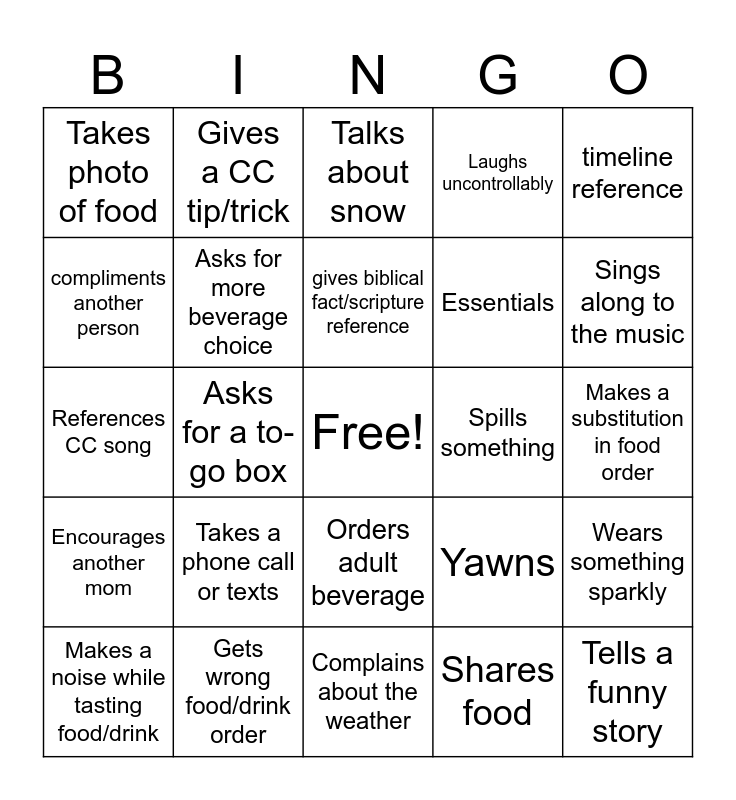 This bingo card has a free space and 24 words: Takes a phone call or texts, Gets wrong food/drink order, gives biblical fact/scripture reference, Makes a noise while tasting food/drink, timeline reference, Takes photo of food, compliments another person, Gives a CC tip/trick, Spills something, Orders adult beverage, Essentials, References CC song, Yawns, Wears something sparkly, Asks for more beverage choice, Shares food, Makes a substitution in food order, Talks about snow, Sings along to the music, Asks for a to-go box, Tells a funny story, Encourages another mom, Laughs uncontrollably and Complains about the weather.
