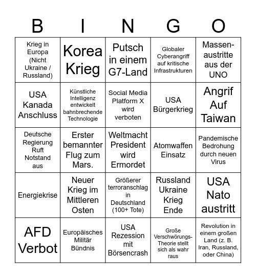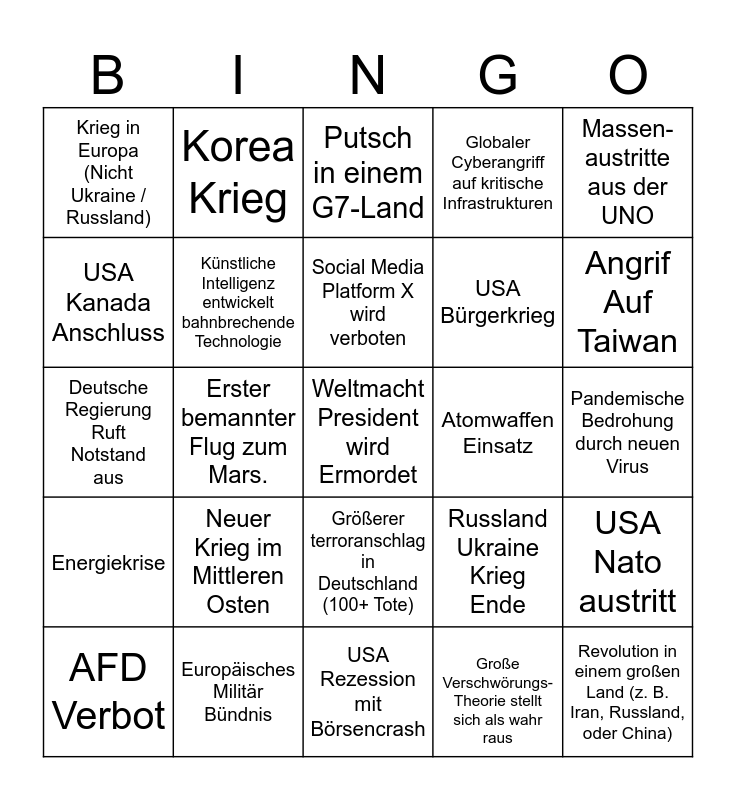 This bingo card has 25 words: Neuer Krieg im Mittleren Osten, USA Rezession mit Börsencrash, Social Media Platform X wird verboten, AFD Verbot, Massen-austritte aus der UNO, Krieg in Europa (Nicht Ukraine / Russland), USA Kanada Anschluss, Korea Krieg, Atomwaffen Einsatz, Größerer terroranschlag in Deutschland (100+ Tote), USA Bürgerkrieg, Deutsche Regierung Ruft Notstand aus, Russland Ukraine Krieg Ende, USA Nato austritt, Künstliche Intelligenz entwickelt bahnbrechende Technologie, Revolution in einem großen Land (z. B. Iran, Russland, oder China), Pandemische Bedrohung durch neuen Virus, Putsch in einem G7-Land, Angrif Auf Taiwan, Erster bemannter Flug zum Mars., Weltmacht President wird Ermordet, Europäisches Militär Bündnis, Energiekrise, Globaler Cyberangriff auf kritische Infrastrukturen and Große Verschwörungs- Theorie stellt sich als wahr raus.