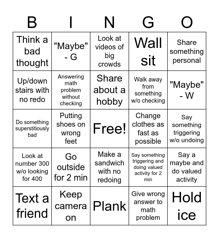 This bingo card has a free space and 24 words: Go outside for 2 min, Keep camera on, Share about a hobby, Text a friend, Share something personal, Think a bad thought, Up/down stairs with no redo, "Maybe" - G, Change clothes as fast as possible, Make a sandwich with no redoing, Walk away from something w/o checking, Do something superstitiously bad, Say something triggering and doing valued activity for 2 min, Say a maybe and do valued activity, Answering math problem without checking, Give wrong answer to math problem, Say something triggering w/o undoing, Look at videos of big crowds, "Maybe" - W, Putting shoes on wrong feet, Hold ice, Look at number 300 w/o looking for 400, Wall sit and Plank.