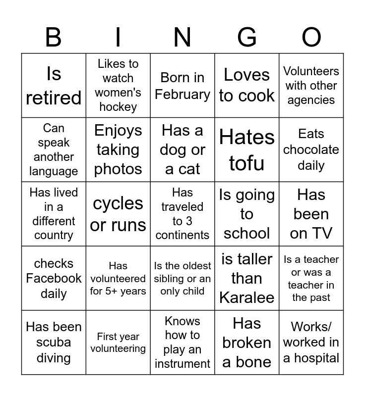 This bingo card has 25 words: Has volunteered for 5+ years, Knows how to play an instrument, Has a dog or a cat, Has been scuba diving, Volunteers with other agencies, Is retired, Can speak another language, Likes to watch women's hockey, Is going to school, Is the oldest sibling or an only child, Hates tofu, Has lived in a different country, is taller than Karalee, Is a teacher or was a teacher in the past, Enjoys taking photos, Works/ worked in a hospital, Has been on TV, Born in February, Eats chocolate daily, cycles or runs, Has traveled to 3 continents, First year volunteering, checks Facebook daily, Loves to cook and Has broken a bone.
