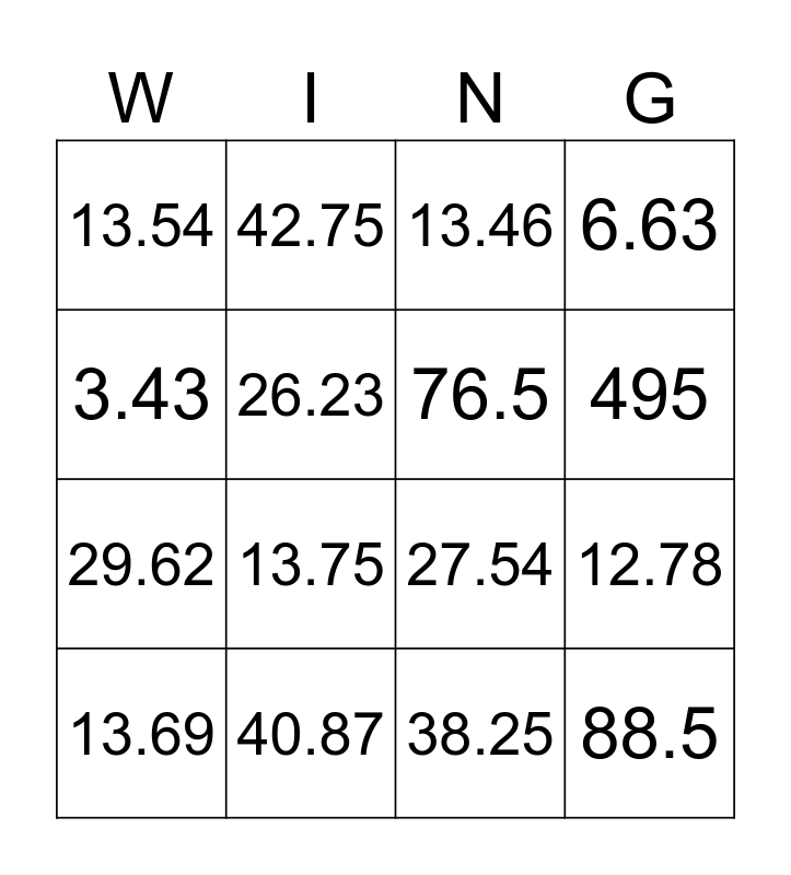 This bingo card has 16 words: 40.87, 12.78, 13.46, 13.54, 29.62, 42.75, 27.54, 38.25, 3.43, 26.23, 13.69, 6.63, 13.75, 495, 76.5 and 88.5.
