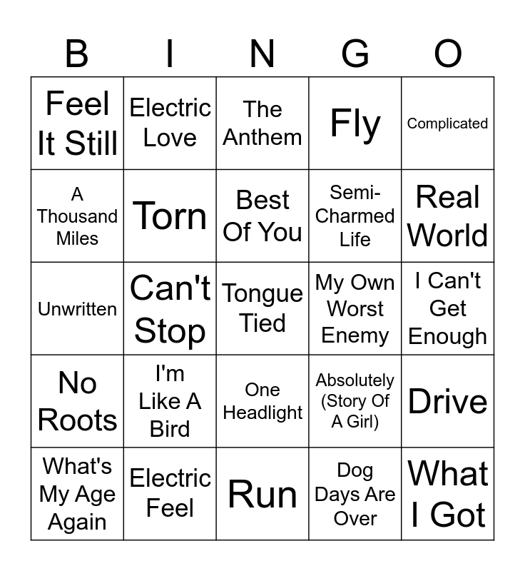 This bingo card has a free space and 34 words: Kryptonite, Dog Days Are Over, That's Not My Name, Hand In My Pocket, No Roots, Torn, Complicated, What's My Age Again, Electric Love, Mr. Jones, Best Of You, The Anthem, Miss Independent, Use Somebody, My Own Worst Enemy, Real World, Electric Feel, Unwritten, I'm Like A Bird, Absolutely (Story Of A Girl), One Headlight, Only Wanna Be With You, Feel It Still, I Can't Get Enough, Run, What I Got, Fly, You Found Me, Semi-Charmed Life, A Thousand Miles, Sugar, We're Goin Down, Can't Stop, Drive and Just A Girl.