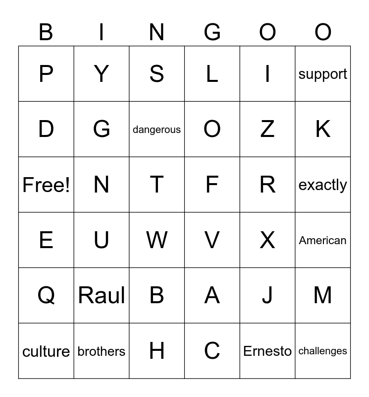 This bingo card has 36 words: A, B, C, D, E, F, G, H, I, J, K, L, M, N, O, P, Q, R, Free!, S, T, U, V, W, X, Y, Z, brothers, dangerous, support, challenges, culture, American, exactly, Raul and Ernesto.