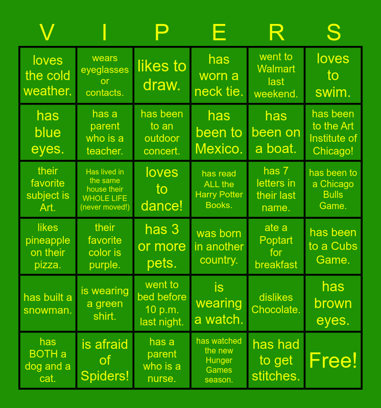This bingo card has 42 words: has had to get stitches., has a parent who is a teacher., likes Chinese Food!, has 7 letters in their last name., has been to a Cubs Game., their favorite color is purple., their favorite subject is Art., Speaks Spanish., likes to draw., has been to a Chicago Bulls Game., loves to dance!, has been to Mexico., has been to the Art Institute of Chicago!, went to Walmart last weekend., is afraid of Spiders!, likes pineapple on their pizza., has brown eyes., has been on a boat., Free!, wears eyeglasses or contacts., loves to swim., went to bed before 10 p.m. last night., has built a snowman., loves the cold weather., their favorite candy is gummy bears., has BOTH a dog and a cat., has been to an outdoor concert., has been to a White Sox game., is wearing a green shirt., dislikes Chocolate., has been to Canada!, has read ALL the Harry Potter Books., has blue eyes., ate a Poptart for breakfast, has a parent who is a nurse., has 3 or more pets., was born in another country., Has lived in the same house their WHOLE LIFE (never moved!), is wearing a watch., has watched the new Hunger Games season., has worn a neck tie. and knows how to knit or crochet..