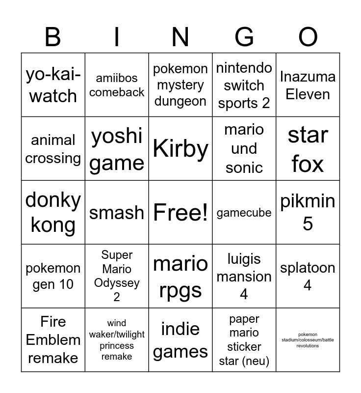 This bingo card has a free space and 24 words: Super Mario Odyssey 2, wind waker/twilight princess remake, Kirby, Fire Emblem remake, Inazuma Eleven, yo-kai- watch, animal crossing, amiibos comeback, gamecube, mario rpgs, mario und sonic, donky kong, luigis mansion 4, splatoon 4, yoshi game, paper mario sticker star (neu), pikmin 5, pokemon mystery dungeon, star fox, smash, pokemon stadium/colosseum/battle revolutions, pokemon gen 10, nintendo switch sports 2 and indie games.