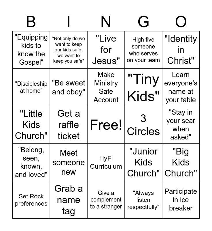 This bingo card has a free space and 24 words: Meet someone new, Grab a name tag, Make Ministry Safe Account, Set Rock preferences, "Identity in Christ", "Equipping kids to know the Gospel", "Discipleship at home", "Not only do we want to keep our kids safe, we want to keep you safe", 3 Circles, HyFi Curriculum, "Tiny Kids", "Little Kids Church", "Junior Kids Church", "Big Kids Church", "Be sweet and obey", "Always listen respectfully", "Stay in your sear when asked", "Live for Jesus", Learn everyone's name at your table, Get a raffle ticket, Participate in ice breaker, "Belong, seen, known, and loved", High five someone who serves on your team and Give a complement to a stranger.