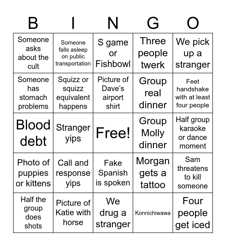 This bingo card has a free space and 24 words: Call and response yips, Picture of Katie with horse, Picture of Dave’s airport shirt, Half the group does shots, We pick up a stranger, Someone asks about the cult, Someone has stomach problems, Someone falls asleep on public transportation, Group Molly dinner, Fake Spanish is spoken, Group real dinner, Blood debt, Morgan gets a tattoo, Sam threatens to kill someone, Squizz or squizz equivalent happens, Konnichiwawa, Half group karaoke or dance moment, S game or Fishbowl, Feet handshake with at least four people, Stranger yips, Four people get iced, Photo of puppies or kittens, Three people twerk and We drug a stranger.