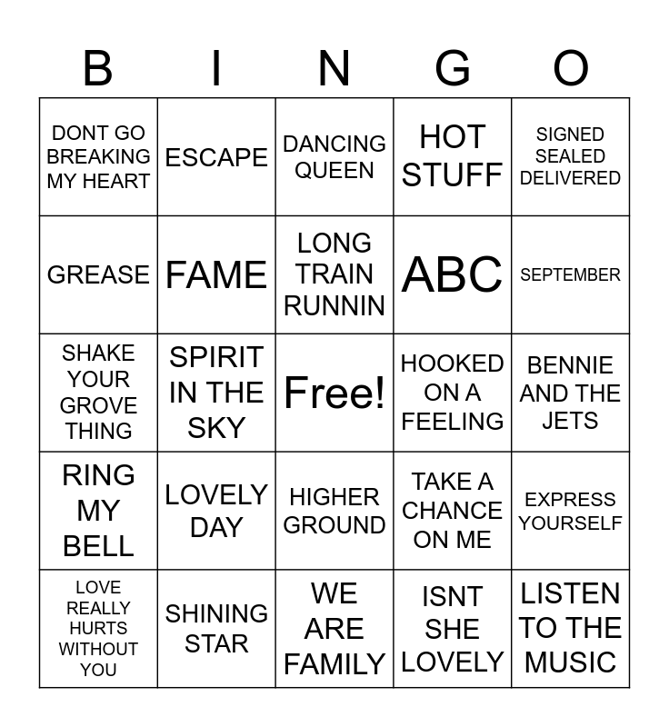 This bingo card has a free space and 24 words: LOVELY DAY, SHINING STAR, LONG TRAIN RUNNIN, LOVE REALLY HURTS WITHOUT YOU, SIGNED SEALED DELIVERED, DONT GO BREAKING MY HEART, GREASE, ESCAPE, HOOKED ON A FEELING, HIGHER GROUND, ABC, SHAKE YOUR GROVE THING, TAKE A CHANCE ON ME, EXPRESS YOURSELF, FAME, ISNT SHE LOVELY, BENNIE AND THE JETS, DANCING QUEEN, SEPTEMBER, SPIRIT IN THE SKY, LISTEN TO THE MUSIC, RING MY BELL, HOT STUFF and WE ARE FAMILY.