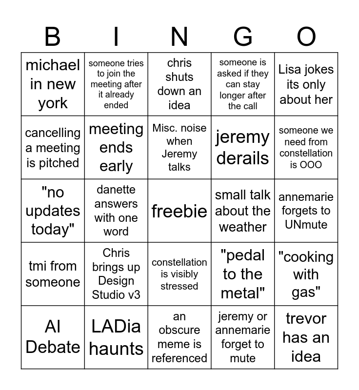 This bingo card has a free space and 24 words: Chris brings up Design Studio v3, LADia haunts, Misc. noise when Jeremy talks, AI Debate, Lisa jokes its only about her, michael in new york, cancelling a meeting is pitched, someone tries to join the meeting after it already ended, small talk about the weather, constellation is visibly stressed, jeremy derails, "no updates today", "pedal to the metal", "cooking with gas", meeting ends early, jeremy or annemarie forget to mute, annemarie forgets to UNmute, chris shuts down an idea, someone we need from constellation is OOO, danette answers with one word, trevor has an idea, tmi from someone, someone is asked if they can stay longer after the call and an obscure meme is referenced.