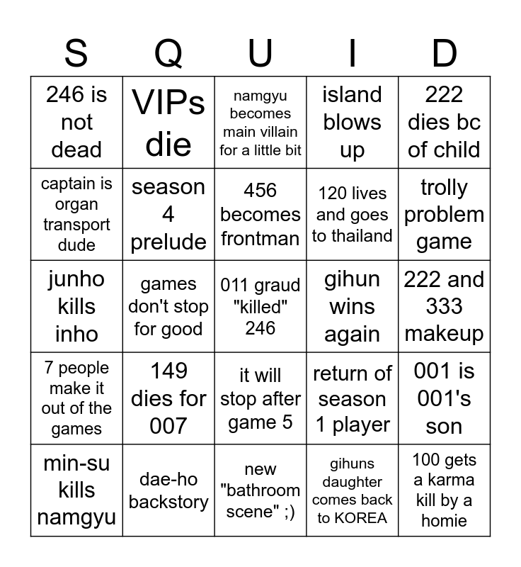 This bingo card has a free space and 24 words: 149 dies for 007, dae-ho backstory, 456 becomes frontman, min-su kills namgyu, 222 dies bc of child, 246 is not dead, captain is organ transport dude, VIPs die, gihun wins again, it will stop after game 5, 120 lives and goes to thailand, junho kills inho, return of season 1 player, 001 is 001's son, season 4 prelude, gihuns daughter comes back to KOREA, 222 and 333 makeup, namgyu becomes main villain for a little bit, trolly problem game, games don't stop for good, 100 gets a karma kill by a homie, 7 people make it out of the games, island blows up and new "bathroom scene" ;).
