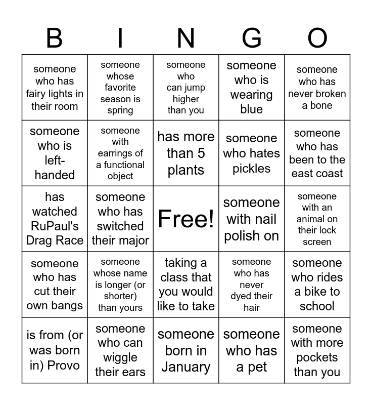 This bingo card has a free space and 24 words: someone whose name is longer (or shorter) than yours, someone who can wiggle their ears, has more than 5 plants, is from (or was born in) Provo, someone who has never broken a bone, someone who has fairy lights in their room, someone who is left-handed, someone whose favorite season is spring, someone with nail polish on, taking a class that you would like to take, someone who hates pickles, has watched RuPaul's Drag Race, someone who has never dyed their hair, someone who rides a bike to school, someone with earrings of a functional object, someone who has a pet, someone with an animal on their lock screen, someone who can jump higher than you, someone who has been to the east coast, someone who has switched their major, someone with more pockets than you, someone who has cut their own bangs, someone who is wearing blue and someone born in January.
