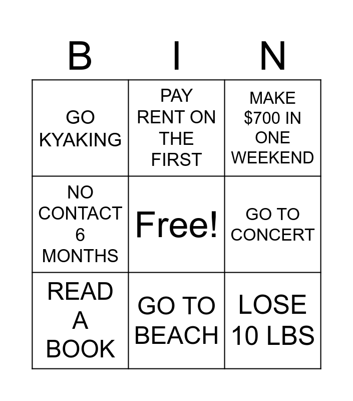 This bingo card has a free space and 8 words: GO TO CONCERT, MAKE $700 IN ONE WEEKEND, PAY RENT ON THE FIRST, READ A BOOK, GO KYAKING, LOSE 10 LBS, NO CONTACT 6 MONTHS and GO TO BEACH.