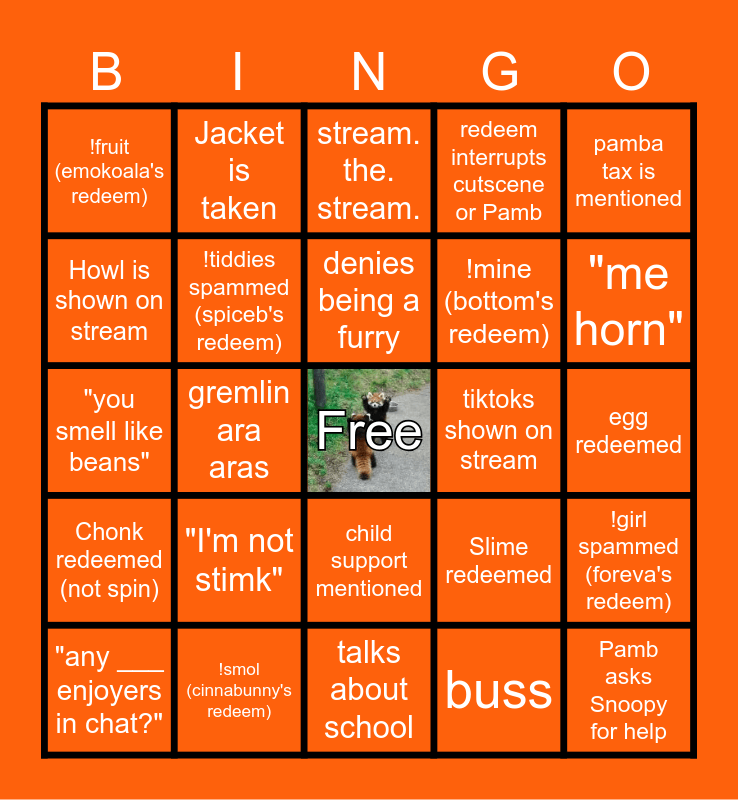 This bingo card has a free space and 24 words: "any ___ enjoyers in chat?", "I'm not stimk", denies being a furry, buss, pamba tax is mentioned, !fruit (emokoala's redeem), Jacket is taken, stream. the. stream., tiktoks shown on stream, egg redeemed, "you smell like beans", !tiddies spammed (spiceb's redeem), Slime redeemed, !girl spammed (foreva's redeem), Howl is shown on stream, !smol (cinnabunny's redeem), talks about school, redeem interrupts cutscene or Pamb, "me horn", Chonk redeemed (not spin), gremlin ara aras, child support mentioned, !mine (bottom's redeem) and Pamb asks Snoopy for help.