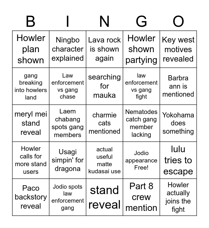 This bingo card has 25 words: Usagi simpin' for dragona, stand reveal, searching for mauka, Paco backstory reveal, Key west motives revealed, Howler plan shown, gang breaking into howlers land, Ningbo character explained, Nematodes catch gang member lacking, actual useful matte kudasai use, law enforcement vs gang fight, meryl mei stand reveal, Jodio appearance Free!, lulu tries to escape, Law enforcement vs gang chase, Howler actually joins the fight, Yokohama does something, Lava rock is shown again, Barbra ann is mentioned, Laem chabang spots gang members, charmie cats mentioned, Jodio spots law enforcement gang, Howler calls for more stand users, Howler shown partying and Part 8 crew mention.