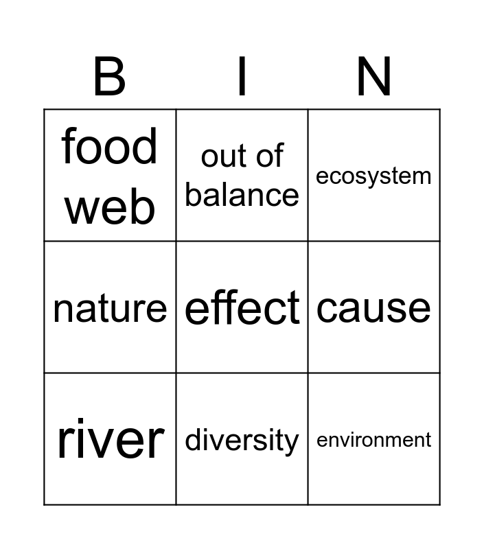 This bingo card has 9 words: river, ecosystem, out of balance, nature, food web, cause, effect, environment and diversity.