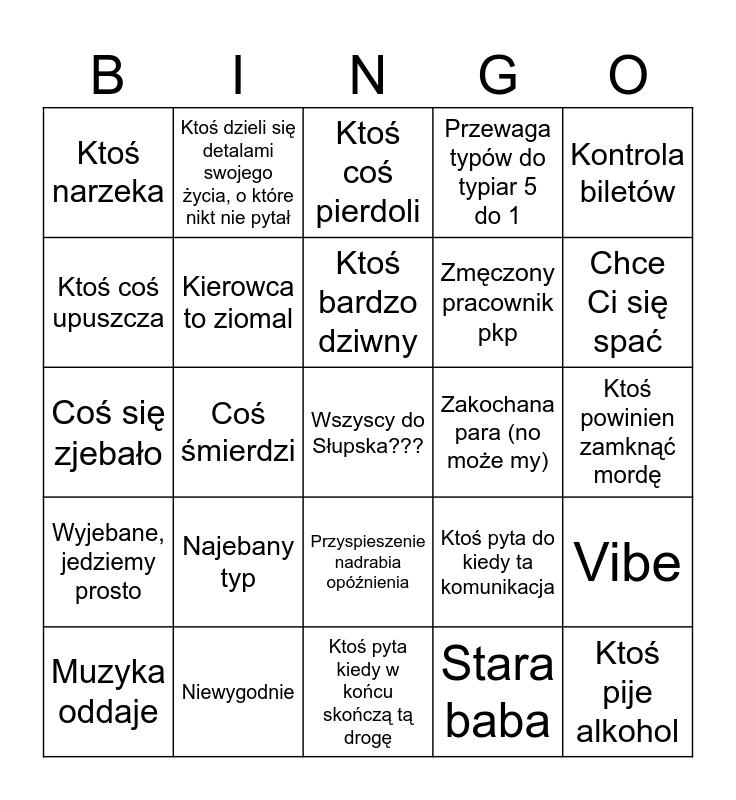 This bingo card has a free space and 24 words: Najebany typ, Niewygodnie, Ktoś bardzo dziwny, Muzyka oddaje, Kontrola biletów, Ktoś narzeka, Ktoś coś upuszcza, Ktoś dzieli się detalami swojego życia, o które nikt nie pytał, Zakochana para (no może my), Przyspieszenie nadrabia opóźnienia, Zmęczony pracownik pkp, Coś się zjebało, Ktoś pyta do kiedy ta komunikacja, Vibe, Kierowca to ziomal, Stara baba, Ktoś powinien zamknąć mordę, Ktoś coś pierdoli, Chce Ci się spać, Coś śmierdzi, Ktoś pije alkohol, Wyjebane, jedziemy prosto, Przewaga typów do typiar 5 do 1 and Ktoś pyta kiedy w końcu skończą tą drogę.