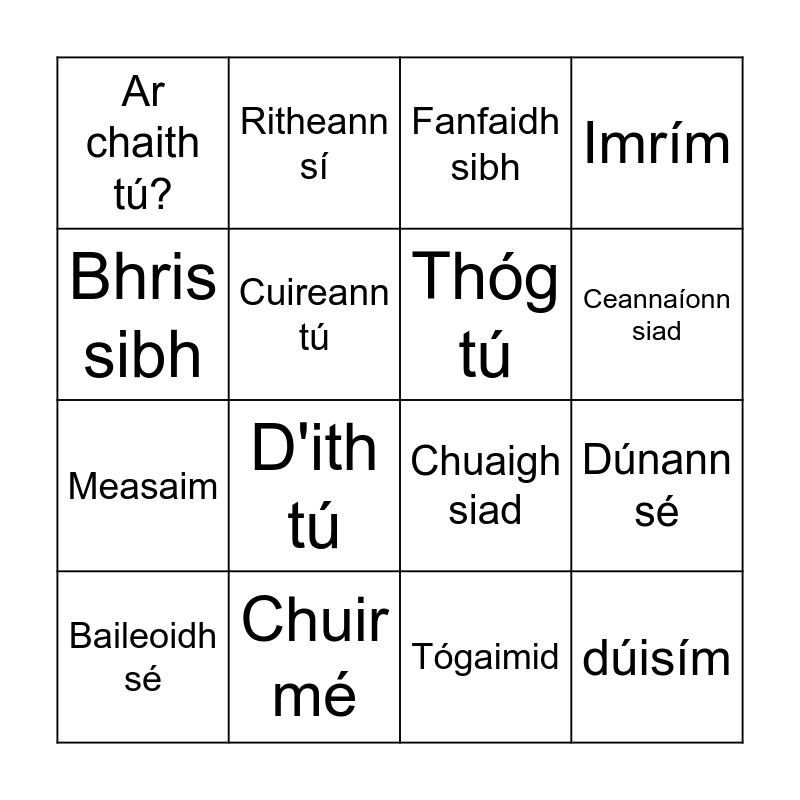 This bingo card has 16 words: Chuir mé, Dúnann sé, Fanfaidh sibh, Ar chaith tú?, Measaim, Ritheann sí, Chuaigh siad, Tógaimid, Bhris sibh, Cuireann tú, Baileoidh sé, Imrím, D'ith tú, Ceannaíonn siad, Thóg tú and dúisím.