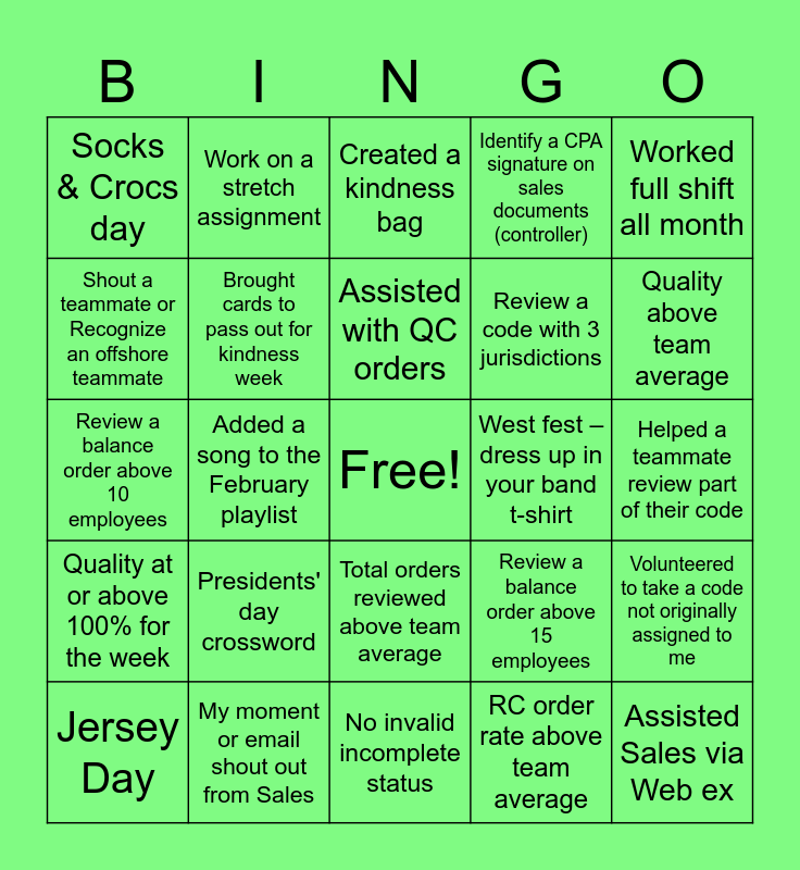 This bingo card has a free space and 29 words: Jersey Day, Added a song to the “January Jams” playlist, Added a song to the February playlist, Submitted a pic for “Dress up your pet day”, Socks & Crocs day, Created a kindness bag, Brought cards to pass out for kindness week, Presidents' day crossword, West fest – dress up in your band t-shirt, My moment or email shout out from Sales, Helped a teammate review part of their code, Assisted Sales via Web ex, No invalid incomplete status, RC order rate above team average, Quality above team average, Arriving to work on schedule time, Total orders reviewed above team average, Quality at or above 100% for the week, Worked full shift all month, Review a balance order above 10 employees, Review a balance order above 15 employees, Review balance order 20 employees, Review a code with 3 jurisdictions, Shout a teammate or Recognize an offshore teammate, Identify a CPA signature on sales documents (controller), Work on a stretch assignment, Volunteered to take a code not originally assigned to me, Assisted with QC orders and No Weekly Errors Reported.
