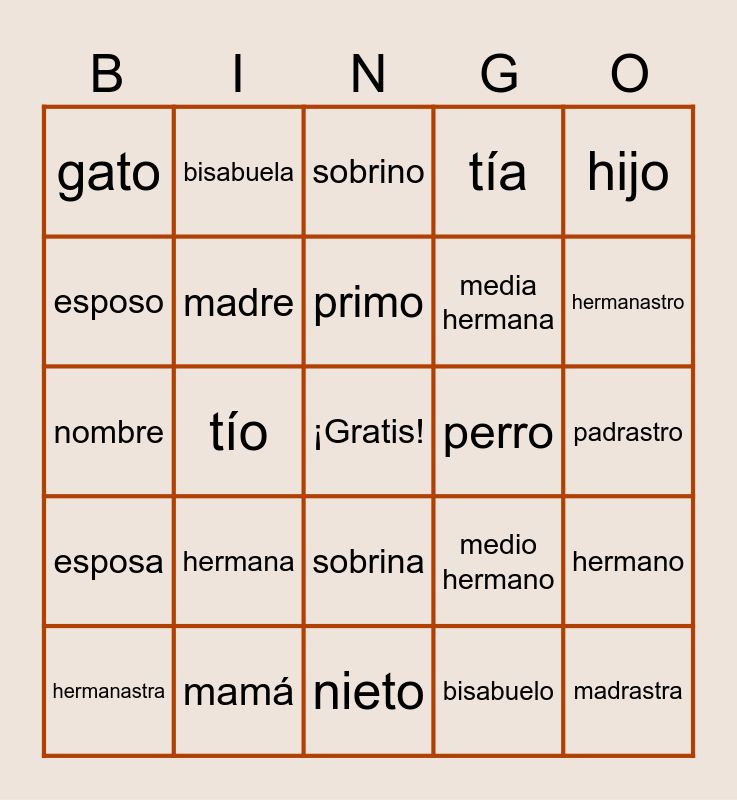 This bingo card has a free space and 37 words: abuelo, abuela, padre, madre, hermano, hermana, primo, prima, hijo, hija, tío, tía, madrastra, padrastro, esposo, esposa, padres, sobrino, sobrina, perro, gato, hermanastro, hermanastra, nieto, nieta, bisabuelo, bisabuela, mascotas, hermanos, hijos, papá, mamá, nombre, apellido, medio hermano, media hermana and bebé.