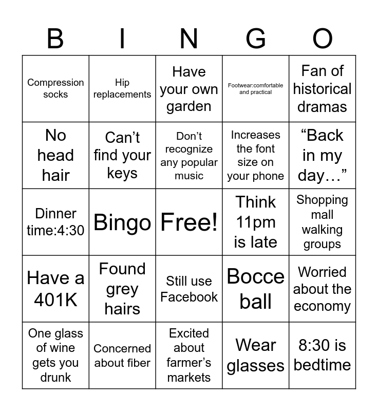 This bingo card has a free space and 24 words: Found grey hairs, Concerned about fiber, Don’t recognize any popular music, One glass of wine gets you drunk, Fan of historical dramas, Compression socks, No head hair, Hip replacements, Think 11pm is late, Still use Facebook, Increases the font size on your phone, Dinner time:4:30, Bocce ball, Worried about the economy, Can’t find your keys, Wear glasses, Shopping mall walking groups, Have your own garden, “Back in my day…”, Bingo, 8:30 is bedtime, Have a 401K, Footwear:comfortable and practical and Excited about farmer’s markets.