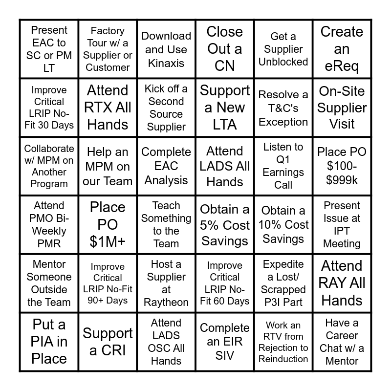 This bingo card has 36 words: Improve Critical LRIP No-Fit 60 Days, Host a Supplier at Raytheon, Complete an EIR SIV, Improve Critical LRIP No-Fit 30 Days, Attend PMO Bi-Weekly PMR, Attend LADS All Hands, Attend RTX All Hands, Attend LADS OSC All Hands, Get a Supplier Unblocked, Expedite a Lost/ Scrapped P3I Part, On-Site Supplier Visit, Close Out a CN, Attend RAY All Hands, Help an MPM on our Team, Support a New LTA, Present EAC to SC or PM LT, Mentor Someone Outside the Team, Listen to Q1 Earnings Call, Collaborate w/ MPM on Another Program, Download and Use Kinaxis, Complete EAC Analysis, Place PO $1M+, Obtain a 5% Cost Savings, Teach Something to the Team, Obtain a 10% Cost Savings, Factory Tour w/ a Supplier or Customer, Resolve a T&C's Exception, Support a CRI, Kick off a Second Source Supplier, Create an eReq, Have a Career Chat w/ a Mentor, Put a PIA in Place, Present Issue at IPT Meeting, Place PO $100- $999k, Improve Critical LRIP No-Fit 90+ Days and Work an RTV from Rejection to Reinduction.