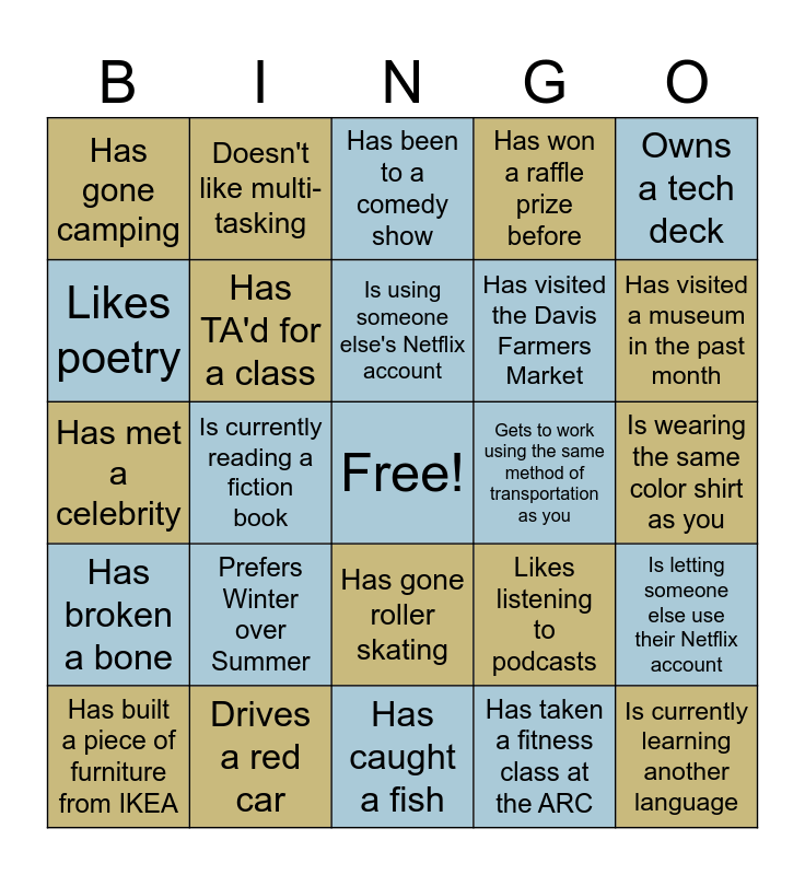 This bingo card has a free space and 24 words: Prefers Winter over Summer, Drives a red car, Is using someone else's Netflix account, Has built a piece of furniture from IKEA, Owns a tech deck, Has gone camping, Likes poetry, Doesn't like multi-tasking, Gets to work using the same method of transportation as you, Has gone roller skating, Has visited the Davis Farmers Market, Has met a celebrity, Likes listening to podcasts, Is letting someone else use their Netflix account, Has TA'd for a class, Has taken a fitness class at the ARC, Is wearing the same color shirt as you, Has been to a comedy show, Has visited a museum in the past month, Is currently reading a fiction book, Is currently learning another language, Has broken a bone, Has won a raffle prize before and Has caught a fish.