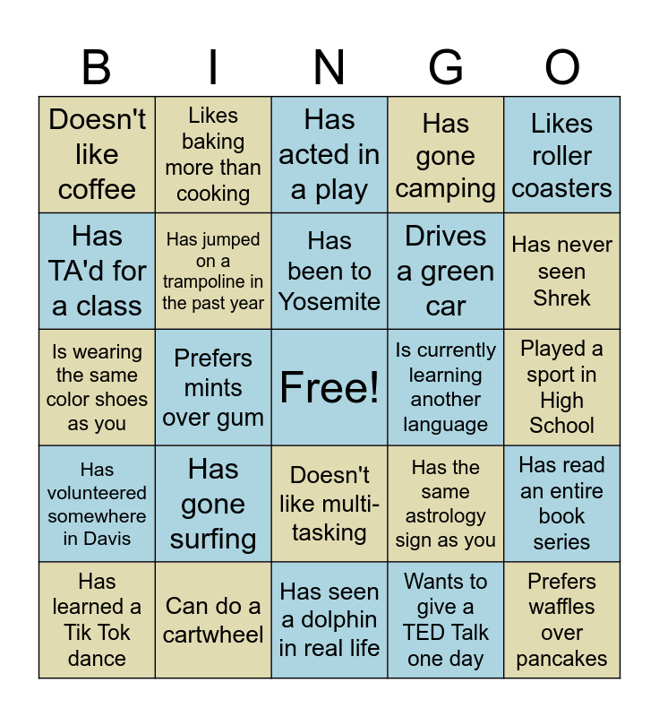 This bingo card has a free space and 24 words: Has gone surfing, Can do a cartwheel, Has been to Yosemite, Has learned a Tik Tok dance, Likes roller coasters, Doesn't like coffee, Has TA'd for a class, Likes baking more than cooking, Is currently learning another language, Doesn't like multi-tasking, Drives a green car, Is wearing the same color shoes as you, Has the same astrology sign as you, Has read an entire book series, Has jumped on a trampoline in the past year, Wants to give a TED Talk one day, Played a sport in High School, Has acted in a play, Has never seen Shrek, Prefers mints over gum, Prefers waffles over pancakes, Has volunteered somewhere in Davis, Has gone camping and Has seen a dolphin in real life.