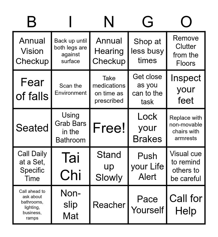 This bingo card has a free space and 30 words: Non-slip Mat, Non-skit Sneakers, Using Grab Bars in the Bathroom, Increased Lighting, Annual Vision Checkup, Annual Hearing Checkup, Scan the Environment, Stand up Slowly, Lock your Brakes, Reacher, Replace with non-movable chairs with armrests, Call for Help, Pace Yourself, Clothes that do not drag, Inspect your feet, Push up from your armrests, Push your Life Alert, Call Daily at a Set, Specific Time, Tai Chi, Remove Clutter from the Floors, Seated, Sit on shower bench, Back up until both legs are against surface, Get close as you can to the task, Fear of falls, Shop at less busy times, Visual cue to remind others to be careful, Call ahead to ask about bathrooms, lighting, business, ramps, Take medications on time as prescribed and Schedule a doctor's appointment.