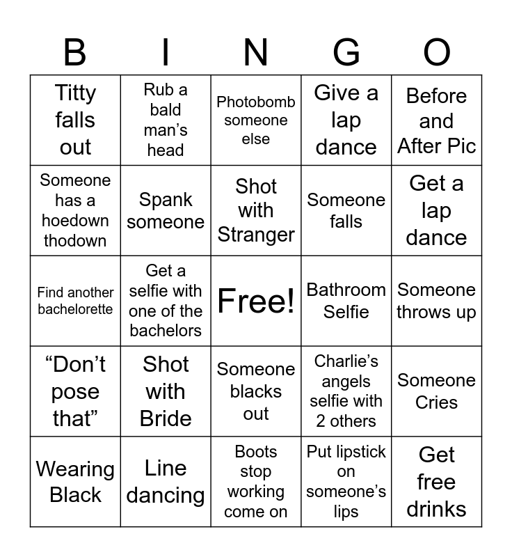 This bingo card has a free space and 24 words: Wearing Black, Shot with Bride, Shot with Stranger, Put lipstick on someone’s lips, Before and After Pic, Titty falls out, Rub a bald man’s head, Photobomb someone else, Bathroom Selfie, Someone throws up, Find another bachelorette, Spank someone, Charlie’s angels selfie with 2 others, Someone Cries, Someone has a hoedown thodown, Line dancing, Boots stop working come on, Give a lap dance, Get a lap dance, “Don’t pose that”, Get a selfie with one of the bachelors, Someone blacks out, Someone falls and Get free drinks.