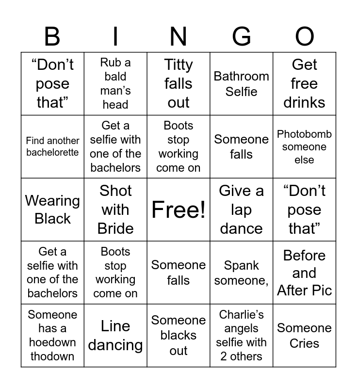 This bingo card has a free space and 53 words: Wearing Black, Shot with Bride, Shot with Stranger, Put lipstick on someone’s lips, Before and After Pic, Titty falls out, Rub a bald man’s head, Photobomb someone else, Bathroom Selfie, Someone throws up, Find another bachelorette, Spank someone, Charlie’s angels selfie with 2 others, Someone Cries, Someone has a hoedown thodown, Line dancing, Boots stop working come on, Give a lap dance, Get a lap dance, “Don’t pose that”, Get a selfie with one of the bachelors, Someone blacks out, Someone falls, Get free drinks, Wearing Black, Wearing Black, Wearing Black, Wearing Black, Wearing Black, Wearing Black, Shot with Bride, Shot with Stranger, Put lipstick on someone’s lips, Someone Cries, Someone has a hoedown thodown, Before and After Pic, Titty falls out, Rub a bald man’s head, Photobomb someone else, Bathroom Selfie, Someone throws up, Find another bachelorette, Spank someone,, Charlie’s angels selfie with 2 others, Line dancing, Boots stop working come on, Give a lap dance, Get a lap dance, “Don’t pose that”, Get a selfie with one of the bachelors, Someone blacks out, Someone falls and Get free drinks ,.