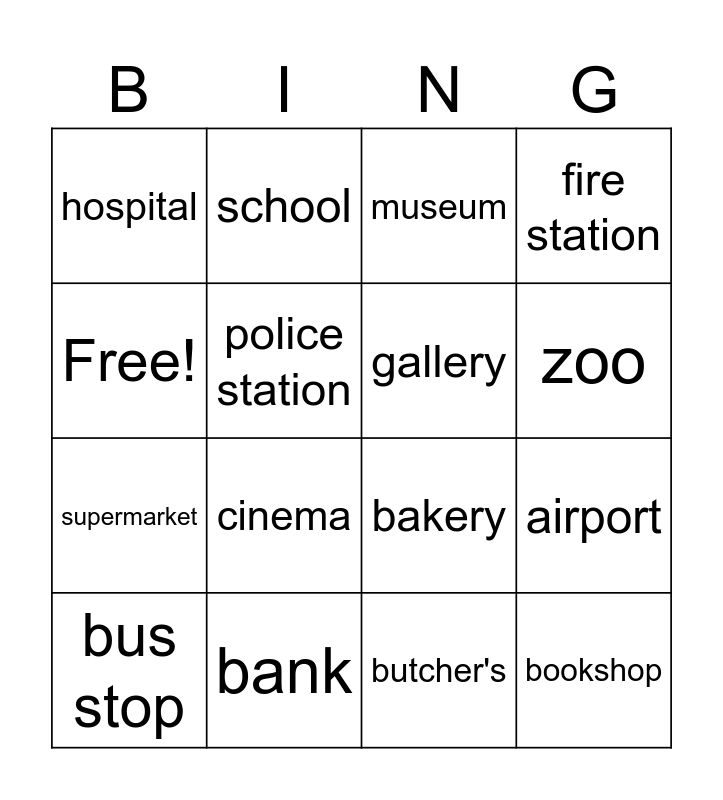 This bingo card has 16 words: bank, airport, museum, hospital, supermarket, school, bakery, butcher's, Free!, police station, bus stop, fire station, cinema, zoo, gallery and bookshop.
