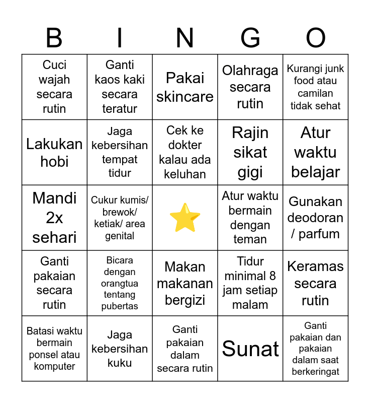 This bingo card has a free space and 24 words: Batasi waktu bermain ponsel atau komputer, Bicara dengan orangtua tentang pubertas, Cek ke dokter kalau ada keluhan, Sunat, Kurangi junk food atau camilan tidak sehat, Cuci wajah secara rutin, Ganti kaos kaki secara teratur, Pakai skincare, Atur waktu bermain dengan teman, Gunakan deodoran / parfum, Mandi 2x sehari, Jaga kebersihan tempat tidur, Tidur minimal 8 jam setiap malam, Keramas secara rutin, Lakukan hobi, Jaga kebersihan kuku, Ganti pakaian dalam secara rutin, Olahraga secara rutin, Atur waktu belajar, Ganti pakaian secara rutin, Cukur kumis/ brewok/ ketiak/ area genital, Makan makanan bergizi, Rajin sikat gigi and Ganti pakaian dan pakaian dalam saat berkeringat.