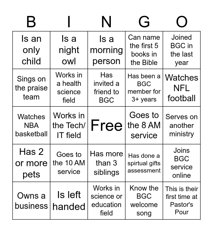 This bingo card has a free space and 24 words: Goes to the 10 AM service, Is left handed, Has invited a friend to BGC, Owns a business, Joined BGC in the last year, Is an only child, Sings on the praise team, Is a night owl, Goes to the 8 AM service, Has more than 3 siblings, Has been a BGC member for 3+ years, Watches NBA basketball, Has done a spirtual gifts assessment, Joins BGC service online, Works in a health science field, Know the BGC welcome song, Serves on another ministry, Is a morning person, Watches NFL football, Works in the Tech/ IT field, This is their first time at Pastor's Pour, Has 2 or more pets, Can name the first 5 books in the Bible and Works in science or education field.