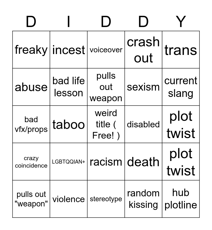 This bingo card has a free space and 24 words: LGBTQQIAN+, violence, pulls out weapon, pulls out "weapon", trans, freaky, abuse, incest, disabled, racism, sexism, bad vfx/props, death, plot twist, bad life lesson, random kissing, plot twist, voiceover, current slang, taboo, hub plotline, crazy coincidence, crash out and stereotype.