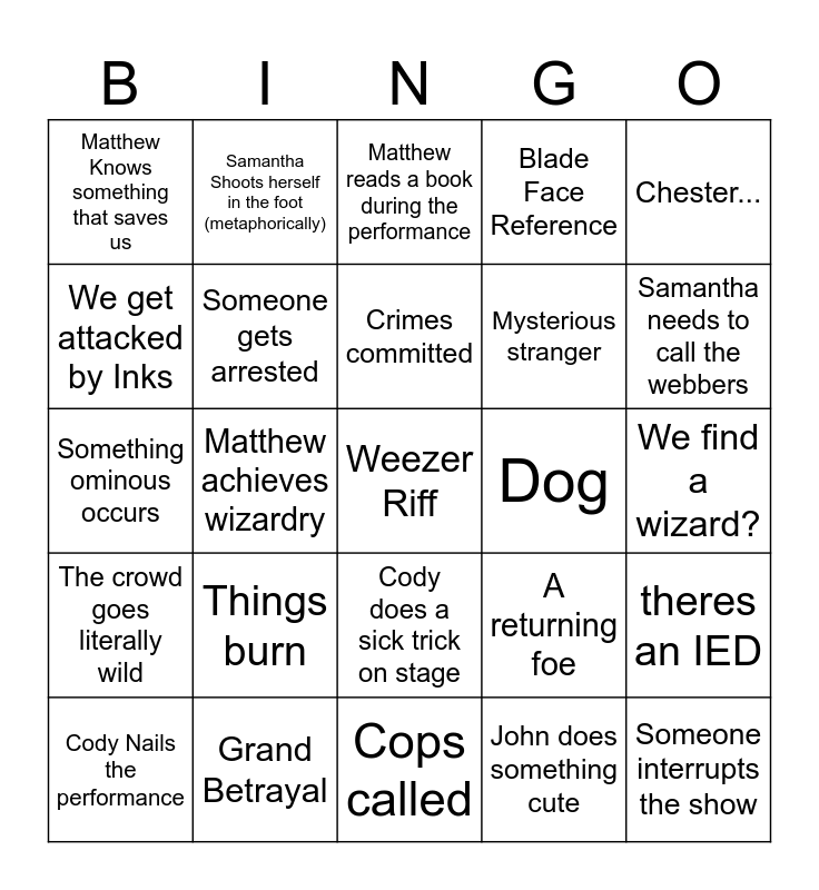 This bingo card has a free space and 25 words: Things burn, Cops called, Crimes committed, Cody Nails the performance, Chester..., Matthew Knows something that saves us, We get attacked by Inks, Samantha Shoots herself in the foot (metaphorically), Dog, Cody does a sick trick on stage, Mysterious stranger, Something ominous occurs, A returning foe, theres an IED, Someone gets arrested, We have to get to a hospital, We find a wizard?, Matthew reads a book during the performance, Samantha needs to call the webbers, Matthew achieves wizardry, Someone interrupts the show, Grand Betrayal, The crowd goes literally wild, Blade Face Reference and John does something cute.