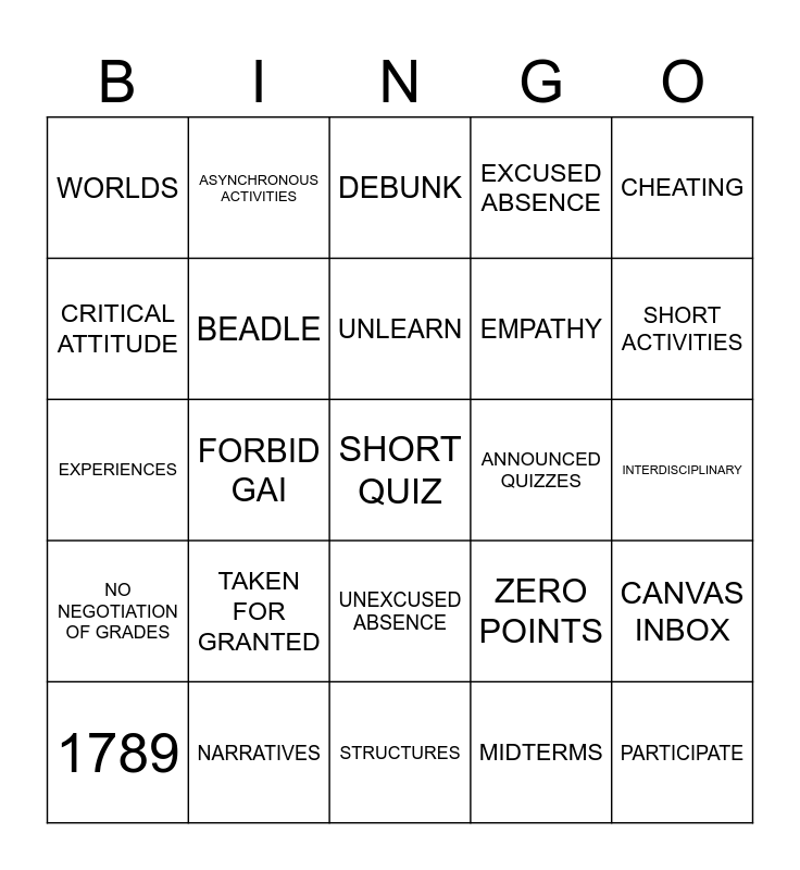 This bingo card has a free space and 34 words: socsc 12, MIDTERMS, MODERNITY, MEDICAL CERTIFICATE, NO NEGOTIATION OF GRADES, BEADLE, CHEATING, 1789, ASYNCHRONOUS ACTIVITIES, COMPREHENSIVE FINAL EXAM, UNLEARN, DEBUNK, PLAGIARISM, ALTERNATIVE PERSPECTIVES, ANNOUNCED QUIZZES, SHORT ACTIVITIES, NARRATIVES, EXPERIENCES, TAKEN FOR GRANTED, ZERO POINTS, UNEXCUSED ABSENCE, APPLICATION, WORLDS, INTERDISCIPLINARY, STRUCTURES, PARTICIPATE, EXCUSED ABSENCE, COMPASSION, EMPATHY, CRITICAL ATTITUDE, EVERYDAY LIFE, FORBID GAI, CANVAS INBOX and 5 MINS AFTER 2ND BELL.