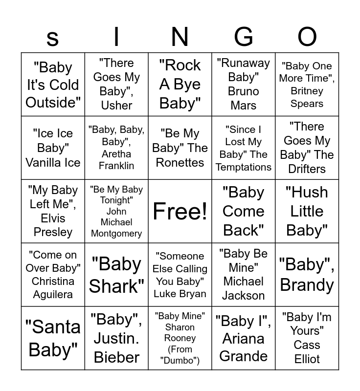 This bingo card has a free space and 24 words: "Baby Shark", "Baby", Justin. Bieber, "Be My Baby" The Ronettes, "Santa Baby", "Baby One More Time", Britney Spears, "Baby It's Cold Outside", "Ice Ice Baby" Vanilla Ice, "There Goes My Baby", Usher, "Baby Come Back", "Someone Else Calling You Baby" Luke Bryan, "Since I Lost My Baby" The Temptations, "My Baby Left Me", Elvis Presley, "Baby Be Mine" Michael Jackson, "Baby", Brandy, "Baby, Baby, Baby", Aretha Franklin, "Baby I", Ariana Grande, "Hush Little Baby", "Rock A Bye Baby", "There Goes My Baby" The Drifters, "Be My Baby Tonight" John Michael Montgomery, "Baby I'm Yours" Cass Elliot, "Come on Over Baby" Christina Aguilera, "Runaway Baby" Bruno Mars and "Baby Mine" Sharon Rooney (From "Dumbo").