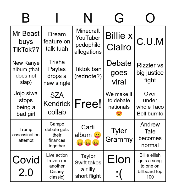 This bingo card has a free space and 24 words: Campo debate gets their finances together, Live action frozen (or another Disney classic), Tiktok ban (rednote?), Covid 2.0, C.U.M, Mr Beast buys TikTok??, New Kanye album (that does not slap), Dream feature on talk tuah, We make it to debate nationals đ, Carti album đđđđ, Debate goes viral, Jojo siwa stops being a bad girl, Tyler Grammy, Andrew Tate becomes normal, Trisha Paytas drops a new single, Elon :(, Over under whole Taco Bell burrito, Minecraft YouTuber pedophile allegations, Rizzler vs big justice fight, SZA Kendrick collab, Billie eilish gets a song to one on billboard top 100, Trump assassination attempt, Billie x Clairo and Taylor Swift takes a rlllly short flight.