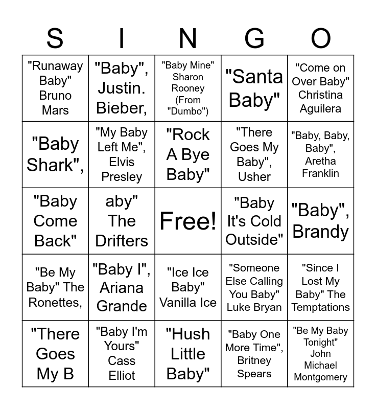 This bingo card has a free space and 25 words: "Baby I", Ariana Grande, "Hush Little Baby", "Rock A Bye Baby", "There Goes My B, "Come on Over Baby" Christina Aguilera, "Runaway Baby" Bruno Mars, "Baby Shark",, "Baby", Justin. Bieber,, "Baby It's Cold Outside", "Ice Ice Baby" Vanilla Ice, "There Goes My Baby", Usher, "Baby Come Back", "Someone Else Calling You Baby" Luke Bryan, "Since I Lost My Baby" The Temptations, "My Baby Left Me", Elvis Presley, "Baby Be Mine" Michael Jackson, "Baby", Brandy, "Baby Mine" Sharon Rooney (From "Dumbo"), "Baby, Baby, Baby", Aretha Franklin, aby" The Drifters, "Be My Baby Tonight" John Michael Montgomery, "Baby I'm Yours" Cass Elliot, "Be My Baby" The Ronettes,, "Santa Baby" and "Baby One More Time", Britney Spears.